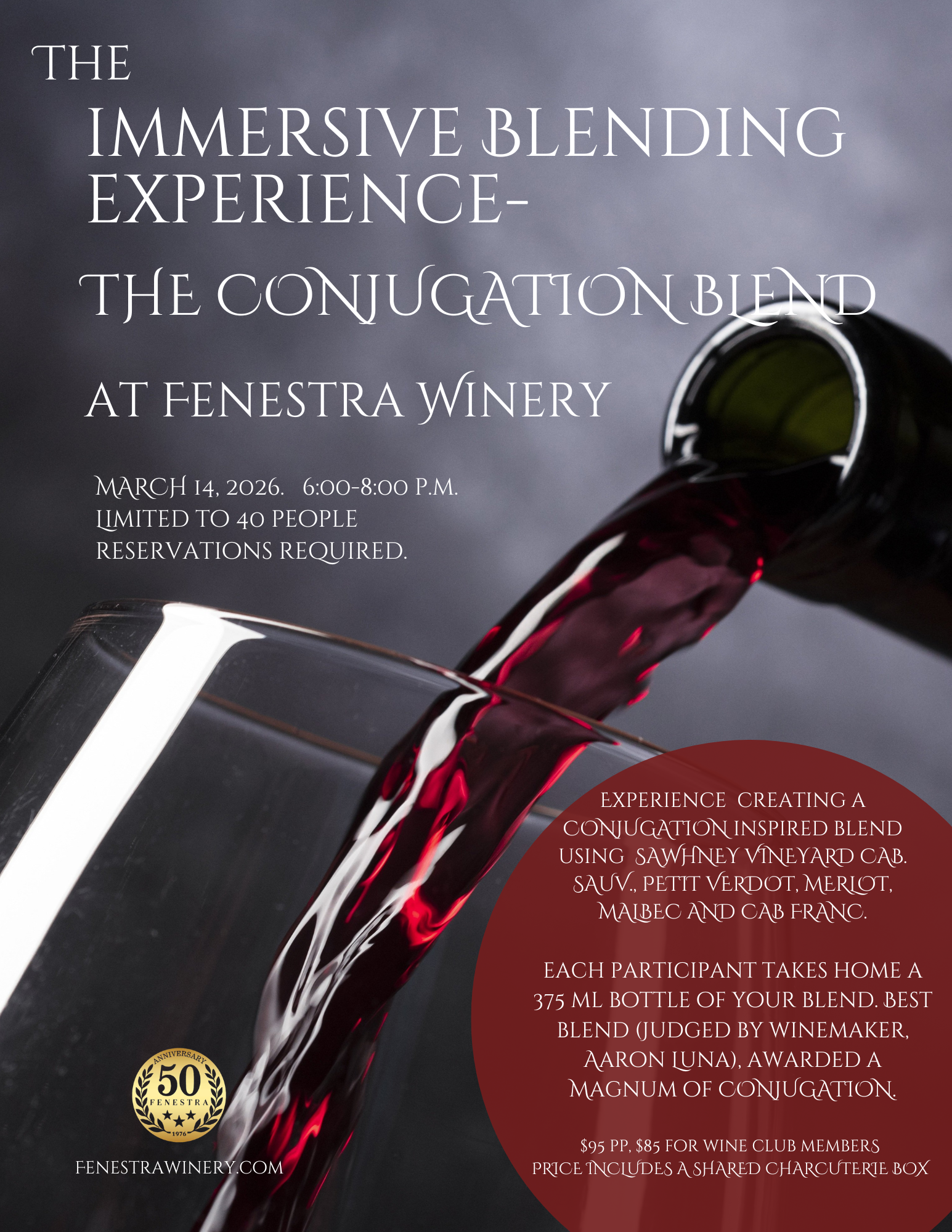 Each person will enjoy a shared charcuterie box, wines to experiment and blend, and a 375 bottle of your own blend. The best blend, as voted by Aaron, will take home a magnum of Fenestra's Conjugation!