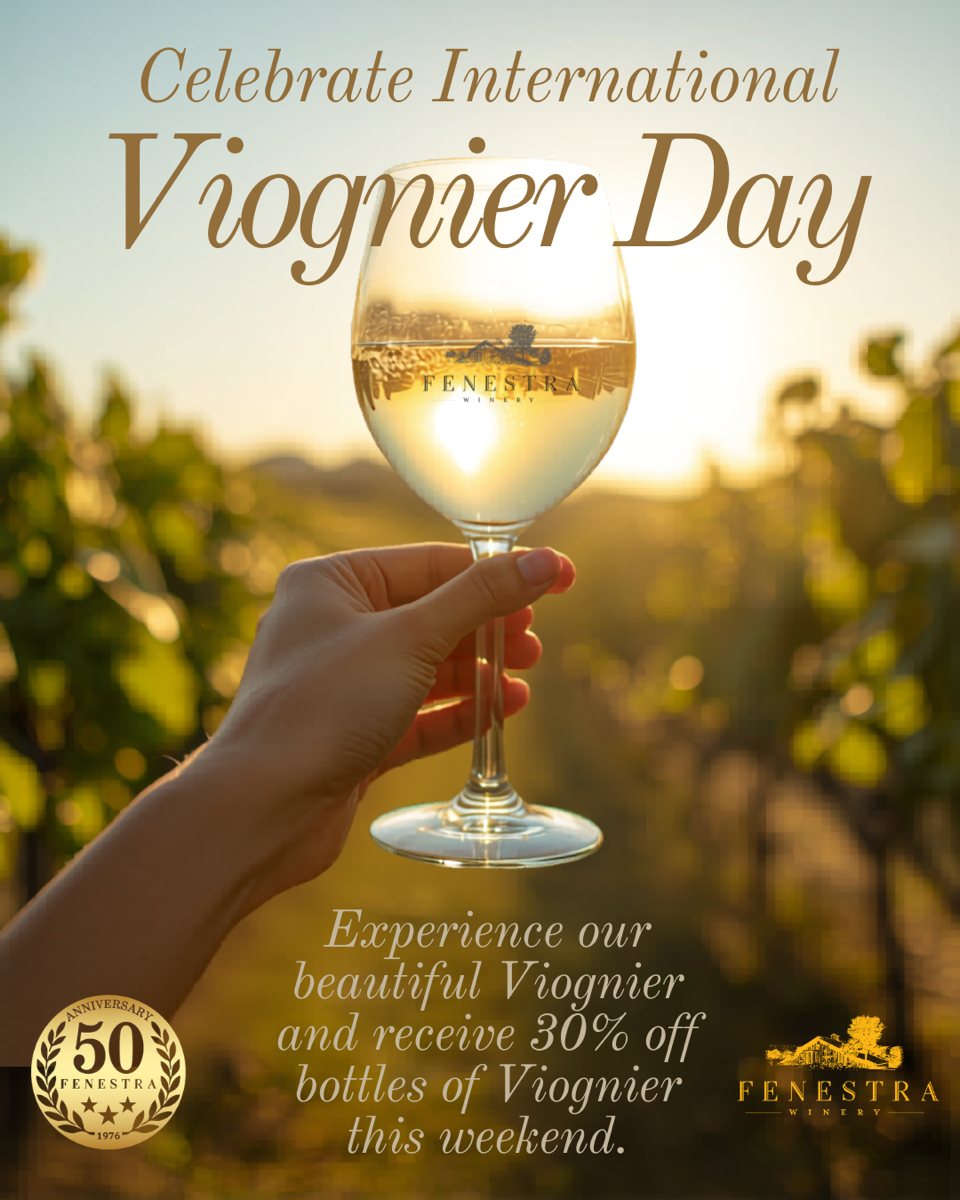 International Viognier Day honors one of the most aromatic and luscious white wine grapes, renowned for its floral fragrance and luscious stone-fruit flavors. Originating from France’s Condrieu appellation, Viognier has gained global acclaim for its full body, silky texture, and sensual bouquet of peach, apricot, and honeysuckle. Fenestra’s Viognier is aged for three months in stainless steel tanks and pairs beautifully with creamy curries, roast chicken and soft cheeses.