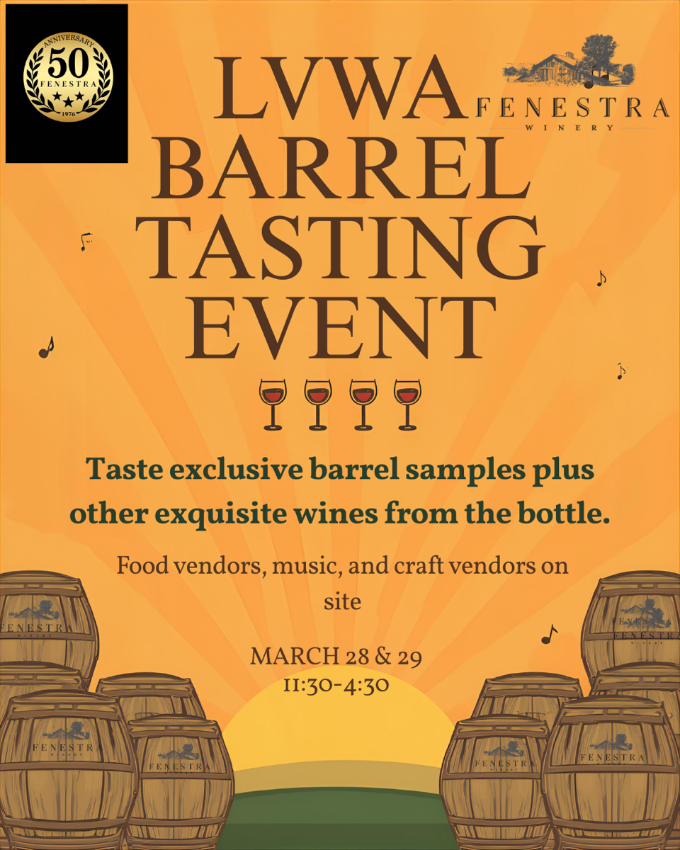 Join us for a special LVWA Barrel Tasting Weekend, March 28 & 29. We are going to offer a special “Barrel Tasting” line up. You will get to try barrel samples of our 2024 Cab Franc and our 2024 Petit Verdot. We will round out your tasting experience with three wines in bottle. This exceptional tasting is $25.00 to the public and free to our wine club members.